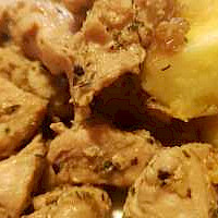 Setjið allt á pönnuna og hitið í eitt augnablik eða þar til eldhúsið fyllist af kryddilmi. Það má gjarnan nota ferskar kryddjurtir ef þær eru við hendina. Veiðið kjúklinginn upp úr marineringarvökvanum og leggið á pönnuna og steikið. Þegar kjúklingurinn er steiktur má hella afgangnum af marineringarvökvanum yfir, ef vill, og sjóða um stund. Bætið kartöflunum á pönnuna og hitið um stund þar til allt er orðið heitt í gegn. |