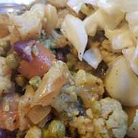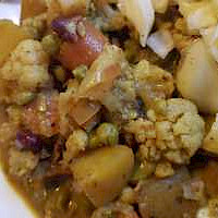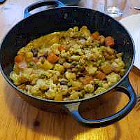 Skerið allt grænmeti niður í hæfilega bita. Bætið öllu útí pottinn, setjið lokið á og látið krauma þar til grænmetið er orðið hæfilega meyrt. Stráið fersku kóríander yfir. |