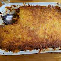 Sett saman í eldfast mót. Fyrst pasta í botninn, svo kjötsósa, svo pasta... Að endingu er ostinum stráð yfir og forminu stungið í 180˚C ofn í 40 mínútur. | ||||||||||||||||||||||||||||