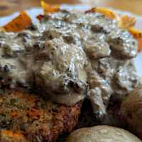 Hitið pönnu og bræðið smjör og hitið olíu. Steikið sveppi og lauk saman þar til vel steikt. | ||||||||||||||||